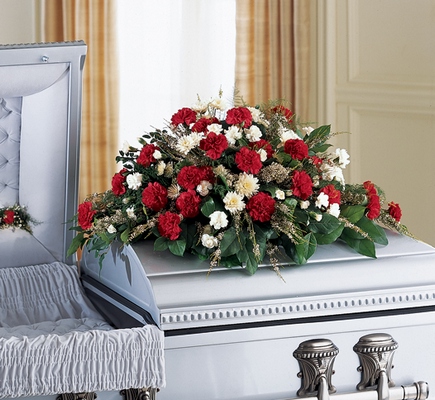 Your loving thoughts are conveyed using red and white blooms against a lush background of greens in this casket spray.